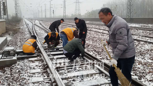 ????11月24日,我市迎來今冬第一場雪。為確保鐵路行車安全,漯阜鐵路有限責(zé)任公司組建黨團(tuán)員突擊隊(duì)清掃道岔積雪,涂油、噴灑防凍液,確保設(shè)備正常運(yùn)轉(zhuǎn),同時(shí)在客運(yùn)站臺鋪設(shè)地毯、防滑墊等,防止旅客摔傷。圖為突擊隊(duì)隊(duì)員清掃道岔積雪。