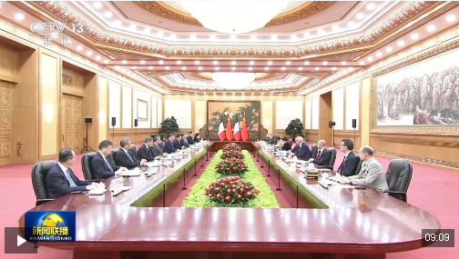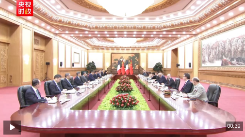會談前,習(xí)近平和夫人彭麗媛在人民大會堂北大廳為馬克龍和夫人布麗吉特舉行歡迎儀式。